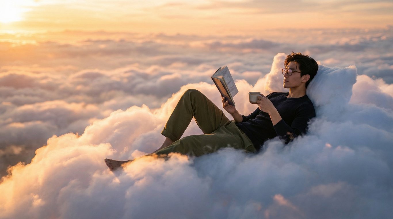 the person from the reference photo ( keep the face of the person 100% accurate from the reference image ) relaxing on a...