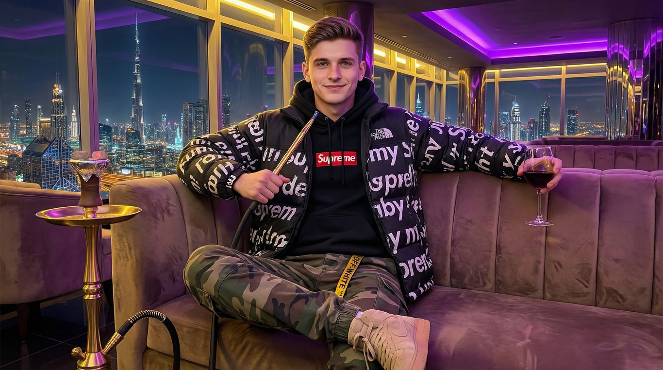 Ultra-realistic 16K portrait of a character attached in the uploaded reference in a Dubai VIP club, maintaining his/her ...