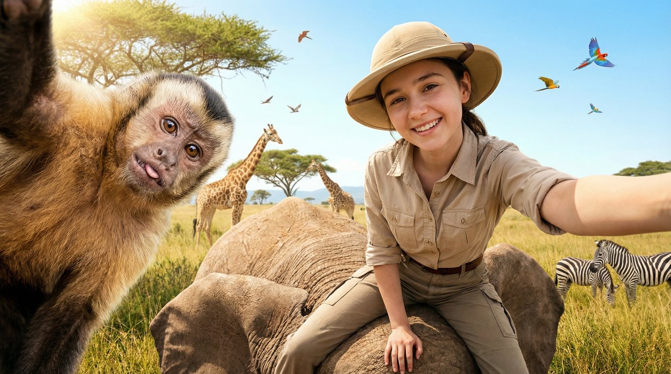 A selfie shot of the man from the uploaded reference image, sitting on top of an elephant during an Africa jungle safari...