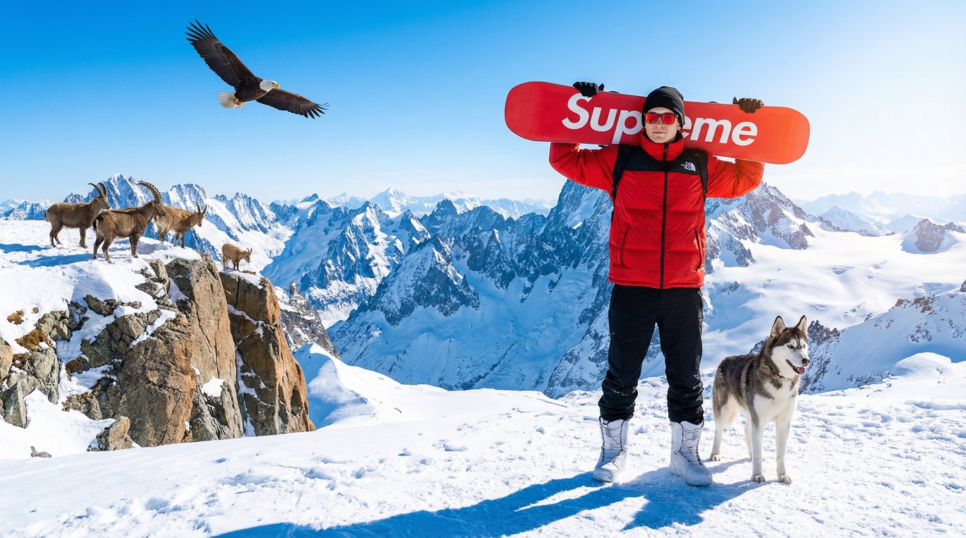 Create a photorealistic image of a person (use the uploaded photo for 100% accurate facial reference) standing on a snow...
